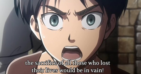 - Eren’s vows to kill them all: “I’ll kill them all! I’ll wipe every one of them… off the face of the earth!” Enough said.